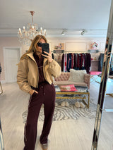 Elevate your casual wardrobe with the Jamie Contrast Stripe Tracksuit in burgundy. This refined two-piece set features a cropped zip-up jacket adorned with striking contrast stripes, paired with tailored drawstring waist trousers for a polished silhouette. The thoughtful design balances comfort with contemporary style, making it equally suited to leisurely afternoons or relaxed social occasions. The coordinated pieces work seamlessly together while offering versatility to mix and match with your existing collection. Crafted for those who appreciate understated elegance in their everyday essentials.