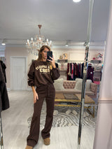 Elevate your casual wardrobe with this refined Los Angeles tracksuit, expertly designed for the modern woman who values both comfort and style. The cropped sweatshirt features the iconic Los Angeles logo, creating an understated focal point that speaks to contemporary fashion sensibilities. Paired with high-waisted straight leg bottoms, this set delivers a flattering silhouette that transitions seamlessly from leisurely afternoons to casual outings. The adjustable drawstring waist ensures a customizable fit, while the coordinated brown palette offers versatile styling possibilities. Crafted for those who refuse to compromise on elegance, this two-piece ensemble proves that athleisure can be both effortlessly chic and thoughtfully constructed.