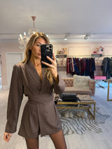 The Amelie Blazer Playsuit combines tailored elegance with contemporary ease. This sophisticated piece features a structured blazer silhouette paired seamlessly with built-in shorts, creating a polished one-piece solution for effortless styling. The single button fastening at the chest provides a refined focal point, while the tie wrap waist with subtle sparkle detail adds movement and visual interest. Perfect for transitioning from day to evening, this black playsuit delivers the sharp lines of formal wear with the comfort and practicality of a modern jumpsuit. An investment piece that works as hard as you do, whether you're heading to the office or stepping out for a special occasion.