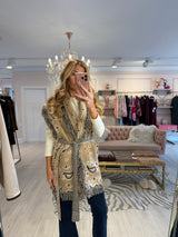 Experience elegant bohemian chic with our IVY PATTERNED FRINGE CARDIGAN. This sleeveless piece features a tie belt and intricate fringe detailing, adding a touch of sophistication to your wardrobe. Embrace the feel of luxury in this exclusive garment that combines elements of art and fashion.