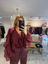 The Presley Ruffle Blouse in Brown is a refined wardrobe essential that effortlessly elevates any ensemble. This lightweight button-down features elegant long sleeves adorned with delicate ruffles, creating subtle texture and movement. The relaxed yet polished silhouette makes it versatile enough for both professional settings and casual occasions. Crafted from breathable fabric, it offers comfort throughout the day without compromising on style. Perfect for layering or wearing standalone, this timeless piece transitions seamlessly from season to season, making it an investment piece worth keeping in your collection.
