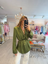 Elevate your spring wardrobe with the Talia Shoulder Pad Belted Blouse in olive, blazer style. This sophisticated piece features structured shoulder pads, a flattering tie waist, and elegant button-down front for a polished look.  One size fits most uk8-uk14.