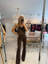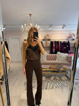 Experience timeless elegance with the YAZ Stretch Flare Trouser in Brown. Designed with a flattering elasticated waist, these trousers offer exceptional comfort and a tailored fit that moves with you. The subtle front seam enhances the silhouette, while the faux back pockets add a refined detail without bulk. Crafted from a stretch fabric, they provide ease of movement and a sleek, polished look ideal for both professional settings and stylish evenings out. Elevate your wardrobe with this sophisticated staple that seamlessly blends comfort and classic style.